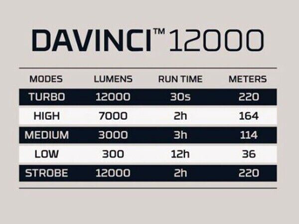 • Turbo (12,000 lumens) - 30 second intervals / 220 meters