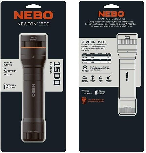The Newton™ 1500 lumen flashlight by NEBO is a powerful handheld flashlight with 4 light modes. The included mode selection dial makes it easy to switch between modes and the powerful LED in this flashlight can light up 182 meters.