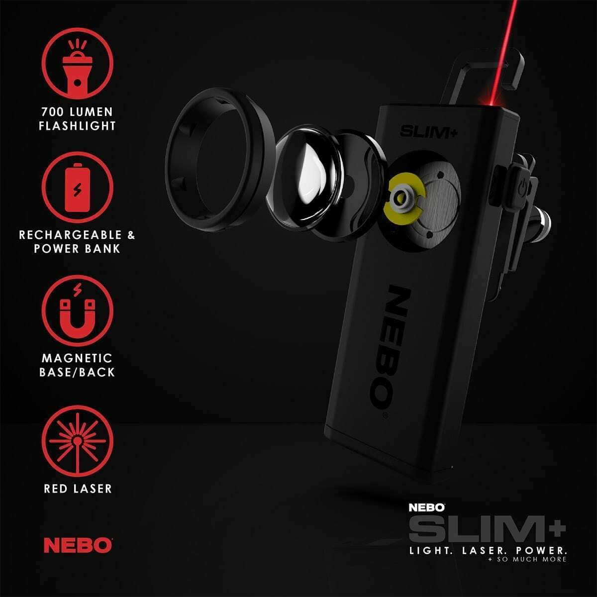 Nebo Slim+ 700 Lumen Rechargeable Pocket Work LED Torch light + Power Bank Laser