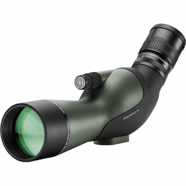 NEW Hawke Endurance ED 15-45 x 60mm Spotting Scope - Green #56194 Key Features Designed to provide a powerful optic with a compact form factor and exceptional eye relief, the 45° angled-viewing Hawke Optics Endurance ED 15-45x60 Spotting Scope is built with anti-reflection fully multicoated extra-low dispersion (ED) glass and a dielectric-coated BAK4 Porro prism—and measures just 12.1 inches long. The glass, prism, and coatings ensure accurate colour representation with improved clarity and contrast, while the 60mm objective lens strikes a balance between size and light-gathering ability to keep the form factor compact while boosting its performance in challenging conditions such as at dawn and dusk or when trying to see into wooded areas under dense canopies. Its broad zoom range allows you to enjoy wide-field viewing at the low 15x with the ability to quickly dial up the power to 45x and make detailed observations of distant subjects with ease. The chassis is made of polycarbonate, which is corrosion, impact, and temperature resistant, and the optical tubes are nitrogen filled and sealed to be water and fog-proof in even extreme weather conditions. This iteration of the Endurance ED has a two-speed focusing system for fast coarse and precision fine focusing—a perfect complement to the wide zoom range. The angled-viewing configuration sets the eyepiece at a 45° angle to the scope's body, which places the user's head in a more comfortable viewing position versus straight-through viewing models. A 1/4"-20 mount makes it compatible with many tripods, quick release plates, and other popular support systems like window mounts, while a stay-on/view-through case offers maximum protection. Optical Performance Use and Handling Construction Details What’s Included? Specification Viewing Angle Angled Prism Type Porro (BAK4) Magnification 15 to 45x Objective Lens Diameter 60 mm Field of View 15x: 147.6' @ 1000 yd / 49.0 m @ 1000 m Minimum Focus Distance 8.2' / 2.5 m Exit Pupil Diameter 15x: 4 mm Eye Relief 20.0 mm Fog-proof Yes, Nitrogen Filled Water Resistance Waterproof Tripod Mounting Thread 1/4"-20 Female Dimensions L: 12.1" / L: 30.8 cm Weight 31.6 oz / 895.0 g
