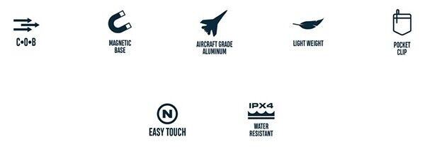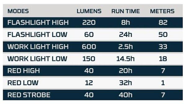 • Work Light (600 lumens): 2.5 hours / 33 meters