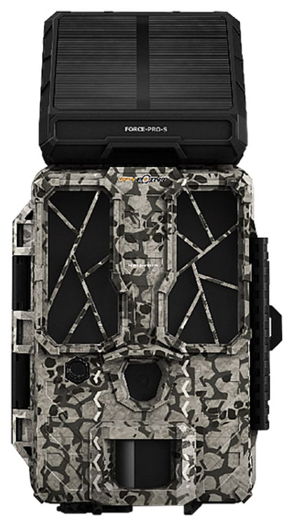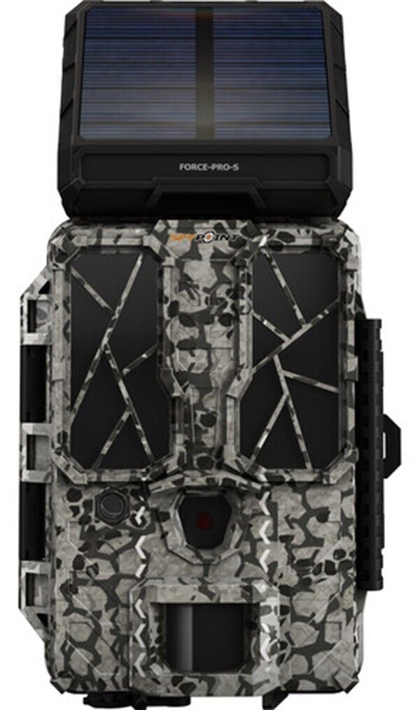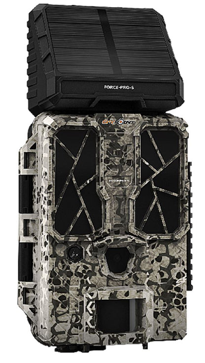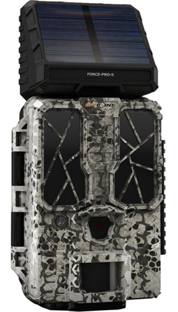 NEW Spypoint FORCE PRO S (Solar) Trail Nature 30 Meg Camera in Camouflage No need to waste time and money on disposable batteries with the Spypoint Force-Pro-S Trail Camera—its built-in solar panel keeps a lithium battery topped off and ready to capture the action on your property or hunting grounds. With a fast 0.2-second trigger time, 30MP photo capability, and 4K video with audio, the Force-Pro-S delivers imagery you need to plan for a successful hunting season. The camera has a detection range of 110' and its 54 infrared LEDs produce a flash range of 90'. The internal lithium battery needs to be charged from an external source before installation; after that, the solar panel takes over. You can also power the camera with 8 AA batteries. General Photos Video Mounting What’s Included? Specification Camera Type Trail/Wildlife Image Resolution 30 MP Focus Type Auto Built-In Flash White No-Glow 940 nm Wavelength IR LEDs Effective Flash Range 90' / 27.4 m Time/Date Stamp Yes Sensor Type Passive Infrared (PIR) Detection Range 110' / 33.5 m Trigger Speed 0.2 Second Burst Capability 6 Images per Trigger (Max) Audio Recording Yes Video Recording Yes Video Clip Length 10, 20, 30, 60 Seconds Waterproof Yes Environmental Protection Advertised as Water Resistant Media/Memory Card Slot Single Slot: SD/SDHC [128 GB Maximum] Internal Storage None Battery Type 1 x Built-In Lithium (Included) External Power Source Capable Yes, 12 VDC (Not Included) Display Yes, 1.5" Color Mounting Mounting Strap (Included) Dimensions 7.6 x 4 x 3.25" / 19.3 x 10.2 x 8.26 cm Package Weight 1.71 lb Box Dimensions (LxWxH) 10.8 x 6.7 x 3.5"