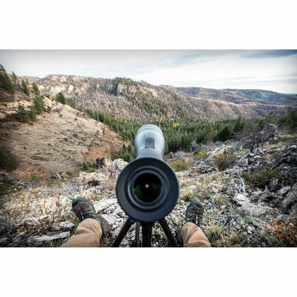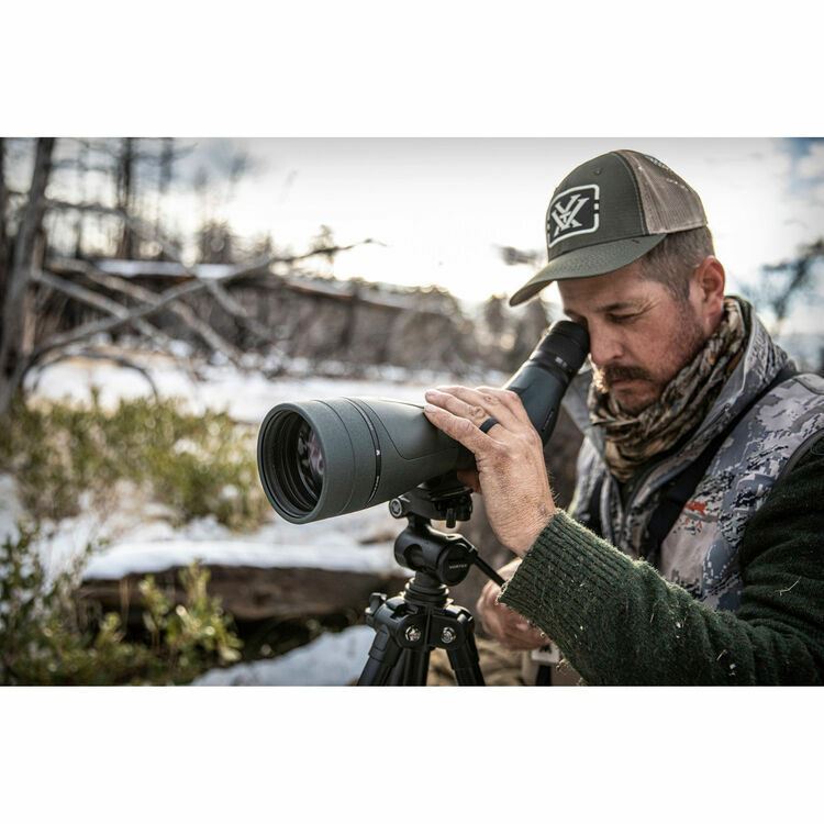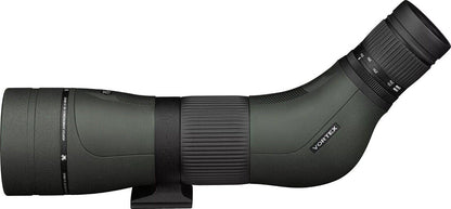 NEW Vortex Diamondback HD 16-48 x 65mm Angled Spotting Scope +Case HD Glass An ideal companion for mid- to long-range shooters and hunters, the 45° angled viewing Vortex Optics Diamondback HD 16-48x65 Spotting Scope delivers bright and sharp high-contrast images with true-to-life color and crisp clarity at all magnifications, even in low or challenging light conditions. Image quality is enhanced through the use of anti-reflection fully multicoated high-density (HD) extra-low dispersion (ED) glass elements in the lens system that maximize light transmission, increase color fidelity and contrast, and improve clarity and resolution through the entire zoom range. The large 65mm objective boosts the spotter's light-gathering capabilities to keep views bright and clear in even challenging light conditions and when observing subjects at long distances at maximum magnification. This version of the Diamondback HD is configured with the eyepiece set 45° to the body to maximize viewing comfort whether you're standing, sitting, or lying prone when looking through it. A helical focus system eliminates the more common knob-based system, providing smooth focusing without the snag hazard that knobs are known for. Its mounting system features a standard 1/4"-20" socket and its shoe is ARCA-style compatible, which means you can directly mount it on an ARCA head without the need for additional plates. Its mounting collar can also be rotated at 45° increments for precise eyepiece placement and optimized viewing comfort. The Diamondback's chassis is argon filled and O-ring sealed to be waterproof and resistant to internal fogging when moving through extreme changes in temperature and environmental conditions. A retractable sunshade prevents lens flare that can spook game and keeps rain and snow off the objective to ensure clear views in less-than-ideal weather. Vortex includes a simple neoprene case that offers further protection against knocks and moisture. Tethered eyepiece and objective caps offer protection while preventing their loss when you're using the spotter. Optical Performance Use and Handling Construction Details What’s Included? Specification Viewing Angle Angled Prism Type Porro Magnification 16 to 48x Objective Lens Diameter 65 mm Field of View 16x: 138.0' @ 1000 yd / 45.8 m @ 1000 m Minimum Focus Distance 16.4' / 5.0 m Exit Pupil Diameter 16x: 4.1 mm Eye Relief 20.3 to 18.3 mm Fogproof Yes, Argon Filled Water Resistance Waterproof Tripod Mounting Thread 1/4"-20 Female Dimensions L: 14.2" / L: 36.2 cm Weight 49.8 oz / 1.4 kg Package Weight 5.48 lb Box Dimensions (LxWxH) 16.2 x 8.4 x 5.5"
