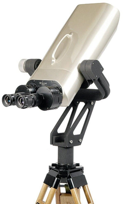 Top-quality waterproof, observation binocular with individual helical eyepiece focusing, designed for medium-to-long-range terrestrial and astronomical observations. Incorporating oversized BAK-4 prisms and a fully broadband multi-coated optical system. Top quality triplet objective lenses provide semi-apochromatic optical performance. Eyepieces are angled at 45°, offering excellent versatility for both terrestrial and astronomical viewing. The eyepieces can also be removed, and replaced with many standard 1.25” astronomical eyepieces for added versatility. The U-Fork mount is specially designed for astronomical use, allowing the binocular to be angled upwards for use at high altitudes approaching the zenith. Features built-in lens hoods, finder-scope shoe and carrying handle. High quality precision all-metal construction. Supplied with heavy-duty hardwood tripod. Binocular supplied in foam-lined storage/carrying case