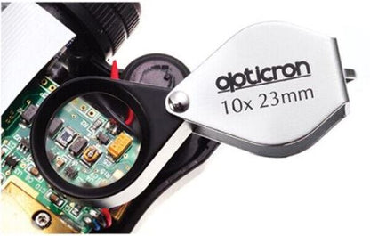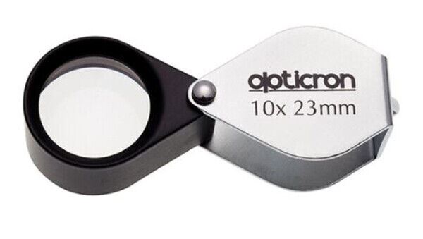 Opticron 10x Magnification 23mm Metal Jewellers Eye Loupe #57103 The 57103 Pocket folding inspection magnifier is suitable for close up inspection of plants & insects as well as reading a variety of small print documents. Features Supplied Accessories Folding Metal Loupe Magnifiers are supplied as magnifier only Guarantee 2 year Product Code 57103Brand new UK Stock, boxed with full Guarantee