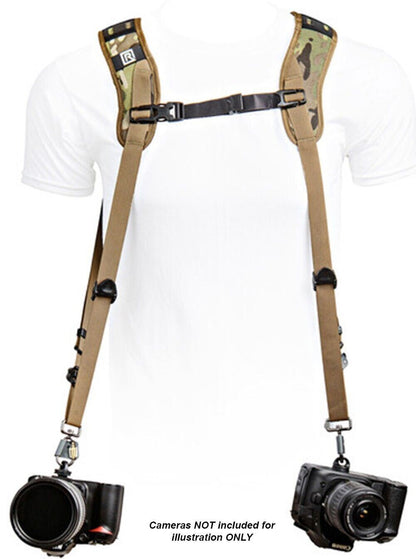 Designed for fast shooting and versatility, the BlackRapid Double Camera Harness, in a multi-terrain camouflage pattern, is the ideal solution for event photographers, music shooters, or press, fashion, street, sports, and wildlife photographers.