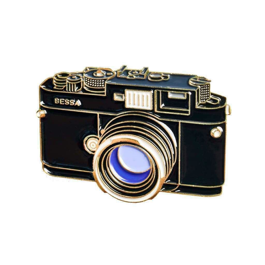 This is a beautiful little Lapel pin badge supplied with clutch back featuring the famous Voigtlander Bessa Rangefinder Film Camera. Finished in Black enamel with Gold detailing and blue accents.