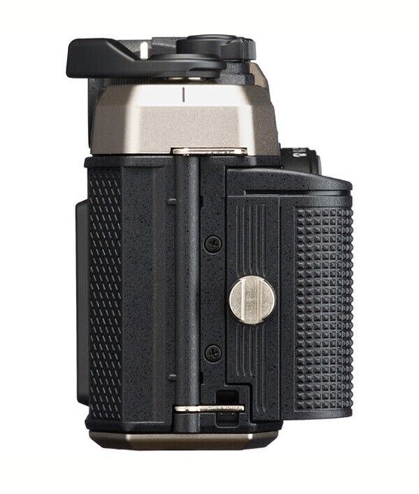 - The front of the camera has a knurled handgrip, which can be removed to reveal the single CR2 3V battery that powers the camera's meter and flash.