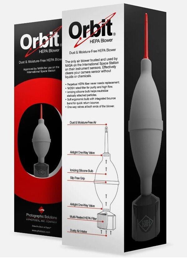 ORBIT HEPA BLOWER - Clean critical optics with the help of this powerful air blaster. Use for SLR, DSLR, and mirror / mirrorless camera sensors & lenses as well as scanners, telescopes, microscopes, binoculars, Oculus, and VR devices.