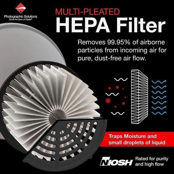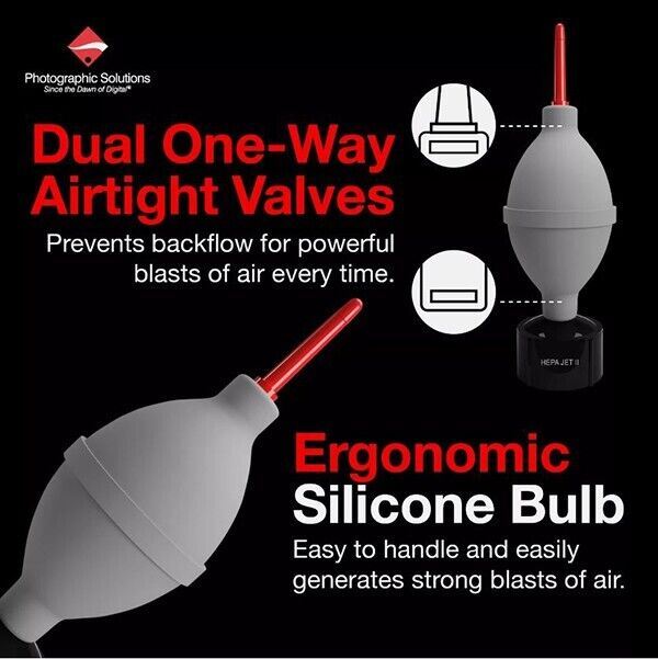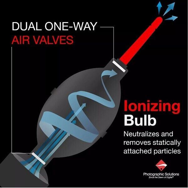 NIOSH RATED FILTER - Camera blower with a NIOSH rated filter for purity and high flow. The Ionizing silicone bulb helps neutralize statically attached particles. Airtight one-way valves at both ends of the blower ensure dust-free cleanliness.