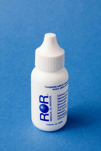 ROR (Residual Oil Remover) 1oz Very High Quality Lens Cleaner Key Features This 1.0 oz Residual Oil Remover, or simply ROR, establishes a new definition of what a 'clean' surface is. The first application of ROR often results in an amazing 'wow' factor for the user; sometimes it's hard to believe what comes off the surface being cleaned. ROR has redefined the science of lens-care by utilizing a formula of natural ingredients that eradicates the counterproductive microscopic oil residues from the surface and pores of glass and plastic. On camera lenses, LCD screens, flat-panel TV's, cell-phones iPods and more - ROR cuts through, breaks down, and allows the removal of all those performance debilitating smudges and smears. Once those oily residues are eliminated, dust, dirt, and pollen particles have nothing to cling to; this enables the sparkling clean surface to remain cleaner for a longer period of time. ROR has been tested and proven to be safe to use on most delicate and precious surfaces; from multicoated lenses to beryllium-surfaced contacts, ROR has proven itself to be one of the finest and safest lens treatments available. ROR can be applied with an untreated micro-fibre cloth or untreated disposable wipes. When using a micro-fibre cloth, it is advisable to wash it out regularly in a mild soap solution that is free of additives or softeners. Washing the micro-fibre cloth before using it with ROR ensures a neutral starting point for a successful cleaning session. The surface to be cleaned must be moistened with ROR prior to wiping; it should be applied to the task-wiper first - not directly on the lens or surface. This prevents pools of liquid from going where it's not supposed to, while conserving the solution. Gently blotting the surface to be cleaned with a moistened cloth or wipe will allow the solution to work into the layers of build-up, facilitating its safe and complete removal. A clean area of the cloth, or a new wipe, should be used for the final cleaning stages. When cleaning a well-loved lens with ROR for the first time, several applications and wipes may be needed to remove the multi-layer build-up of oils, pollution, and dirt. Not recommended for use on focusing screens, CCD/CMOS sensors, or internal aliasing filters Safely cleans lenses, scanners, LCD screens, optics, TVs, iPods, etc
