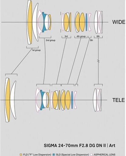 - Six "F" Low Dispersion (FLD), two Special Low Dispersion (SLD) elements, and five aspherical elements markedly reduce chromatic aberrations and color fringing throughout the zoom range for improved clarity and color accuracy. Also, increased control over sagittal coma flare yields high resolution across the entire frame.