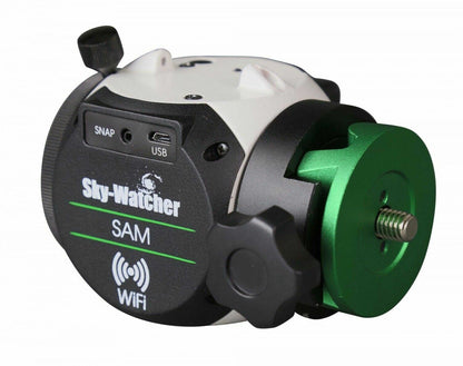 SkyWatcher Star Adventurer Mini Astro Imaging Bundle WiFi (SAM) PRO Pack #50210 The Sky-Watcher Star Adventurer Mini Wi-Fi (SAM) is a compact high-precision camera tracking platform that is ideal for long exposure astro-photography as SAM comes with built-in WiFi and the free Star Adventurer Mini Console App for Android and iOS platforms allowing it to be remotely controlled with your smartphone. SAM is easy to set up and to operate in all of its modes. Although capable of supporting larger camera lenses, SAM is ideal and very simple to use for Wide field Astro-photography with a standard camera lens of 55mm or shorter focal length, as only a rough polar alignment is necessary, making it ideal for all kinds of amateur photographers unfamiliar with astronomy. Star Adventurer Mini Wi-Fi (SAM PRO PACK): includes the Star Adventurer Mini Wi-Fi (SAM) mount, ball head adaptor, polarscope, polarscope illuminator, equatorial wedge and dovetail L-bracket. Sky-Watcher shutter release cables can be purchased separately for most popular camera models/brands. The Star Adventurer Mini Wi-Fi can attach to any standard tripod via its ¼” or 3/8” adaptors. The latitude can be set by either adjusting the tilt of your tripod head to match your latitude or more accurately by using the supplied Equatorial Wedge. To fit a camera to the Star Adventurer, either a tripod Ball Head is required (not supplied) or the supplied Dovetail L-Bracket. The Dovetail L-Bracket can be used in conjunction with the optional counterweight shaft/counterweight (available separately). Features: