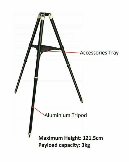 A lightweight and highly portable aluminium tripod with handy accessory tray ideal for the Star Adventurer and Star Adventurer Mini photo mountings, as well as other products requiring a tripod with 3/8" screw connector.