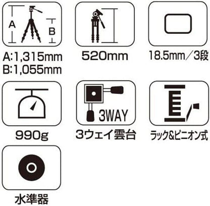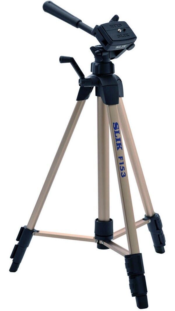 The Slik F153 Lightweight Aluminum Tripod with 3-Way Panhead is an extremely portable & affordable tripod with an integrated panhead that features a pan bar and independent adjustments for pan and tilt. The F153 supports loads up to 3.5 lb, so you'll be able to mount your DSLR, point & shoot, or compact camcorder to the 1/4"-20 stud of the included quick-release plate. The tripod reaches a maximum height of 51.8" with its center column fully extended. The geared, rack & pinion-style center column allows for fine adjustments to the tripod's height, and a center brace enhances its overall sturdiness. Despite the presence of the center brace, the F153 can operate quite low to the ground, with a minimum height of 20.5". The aluminum F153 weighs only 2.2 lb and folds down to only 20.5" (including the panhead) for easy airline transport in a carry-on bag. Three-section legs with flip locks Leg tube cross-section has a rounded rectangular shape Rubber feet Bubble level Specification Load Capacity 3.5 lb (1.6 kg) Maximum Height 51.8" (131.5 cm) Maximum Height w/o Column Extended 41.5" (105.5 cm) Minimum Height 20.5" (52.0 cm) Folded Length 20.5" (52.0 cm) Weight 2.18 lb (0.99 kg) Head Type 3-way panhead Quick Release Yes Material Aluminum Diameter Top leg section: 0.73" (18.5mm) Head Attachment Fitting N/A Leg Stages/Sections 2/3 Leg Lock Type Flip lock Independent Leg Spread No Spiked/Retractable Feet No/no Center Brace Yes Center Column Type Geared (rack & pinion) Bubble Level Yes Box Dimensions (LxWxH) 21.1 x 4.9 x 3.6"