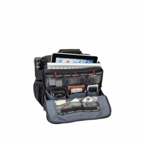 On the front, a foam-padded compartment is perfect for carrying the iPad or other 10" screen Netbook. Apple's wireless keyboard also fits in a special sleeve in this compartment. The front accessory pocket has Window-pane Mesh™ pockets inside to organize small adaptors, memory cards, and extra batteries. There are also three paraphernalia pockets for securing larger items like a small digital camera, phone, or iPod.