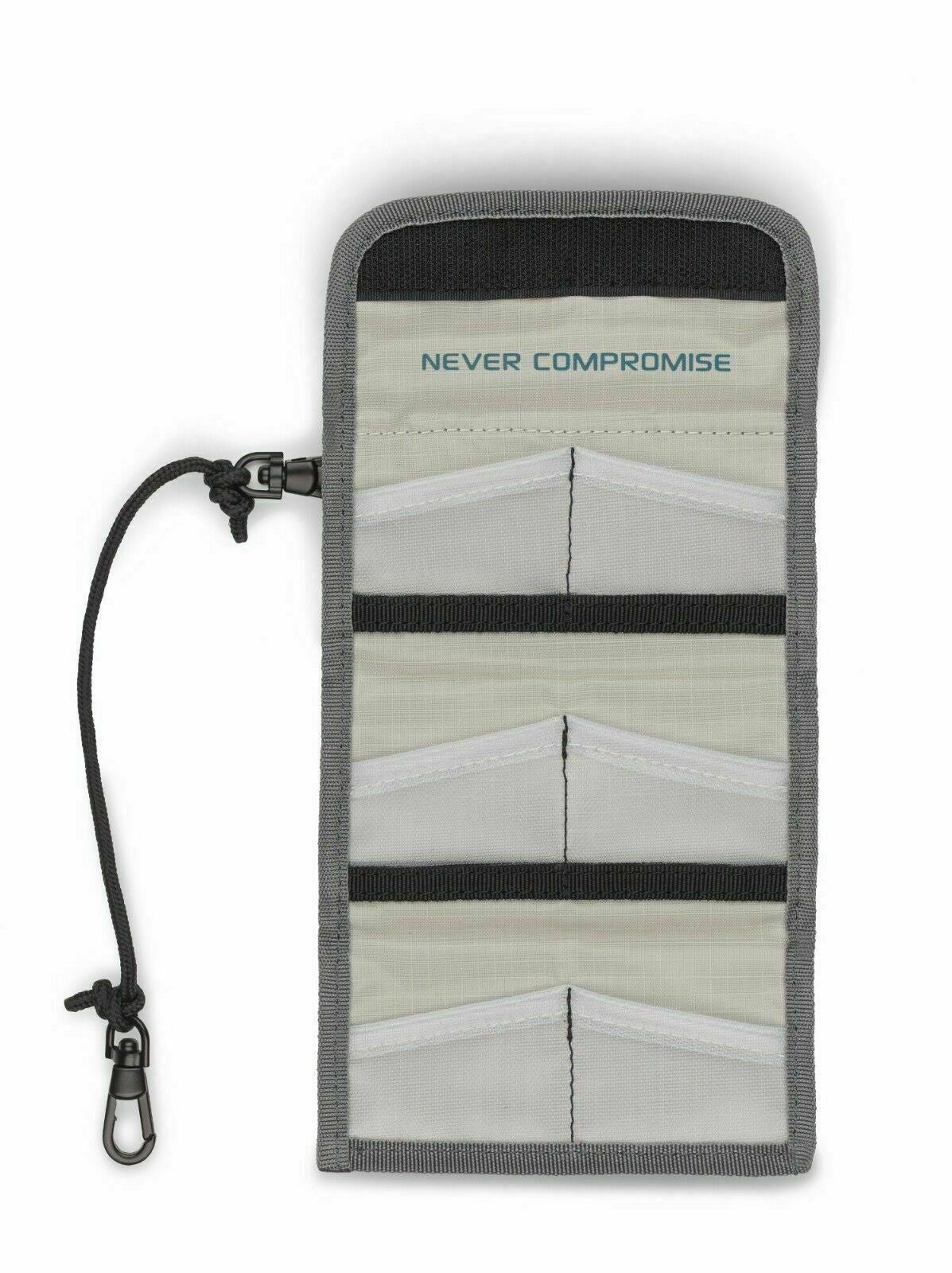 Tenba's unique angled card slots make it easy to remove cards quickly. Rear velcro loop easily attaches to belt, shoulder strap or backpack harness straps for quick access to cards at all times. Security cord with durable metal clips can be attached to D-ring on a bag or tripod for safety. Clear rear pocket for business card. Exterior of water-repellant shadow ripstop nylon.