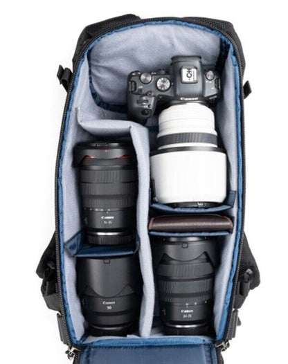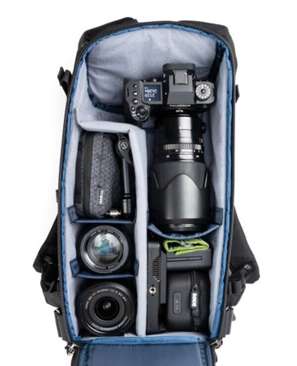 - Adjustable dividers accommodate large telephoto lenses, traditional photo gear, or personal items