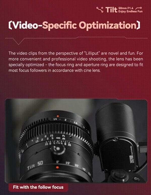 Video-specific optimization: The focus ring and aperture ring have been designed to fit the majority of focus following rigs, standard practice in most cine lenses.