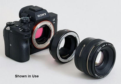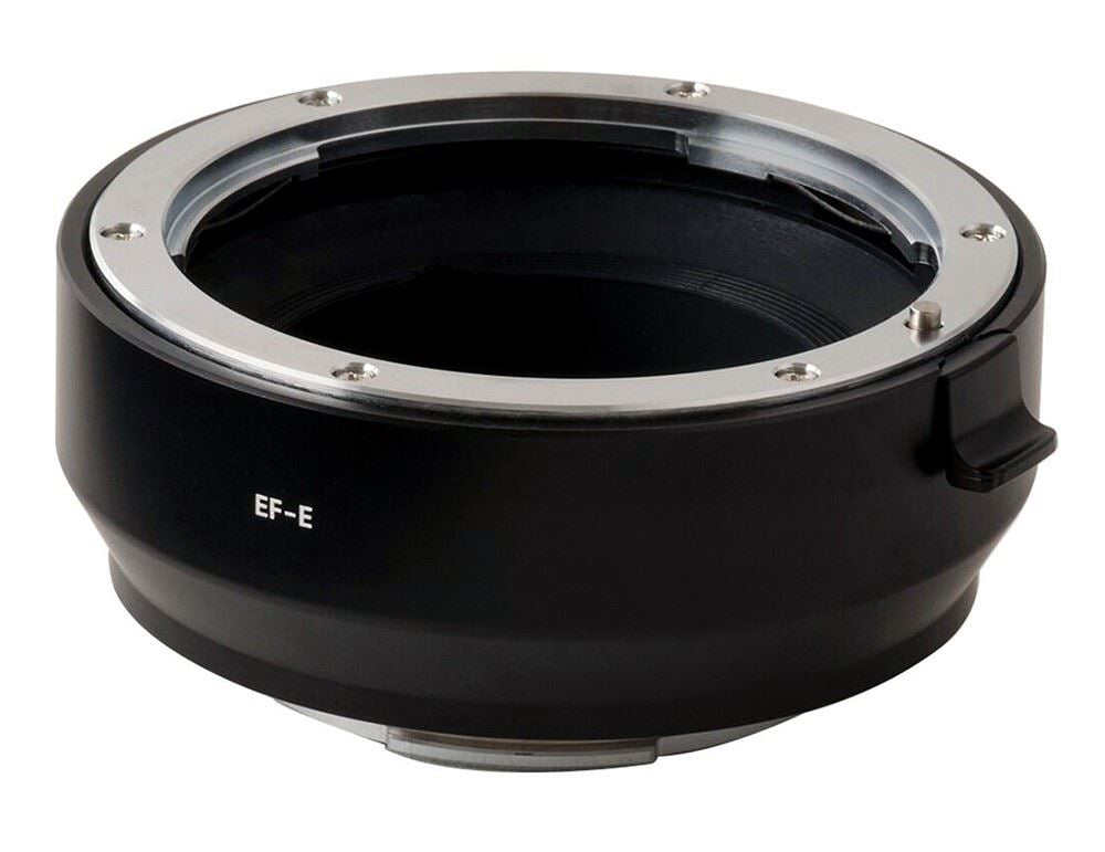 An electronic adapter for pairing any Canon EF mount lens with any Sony E mount camera.