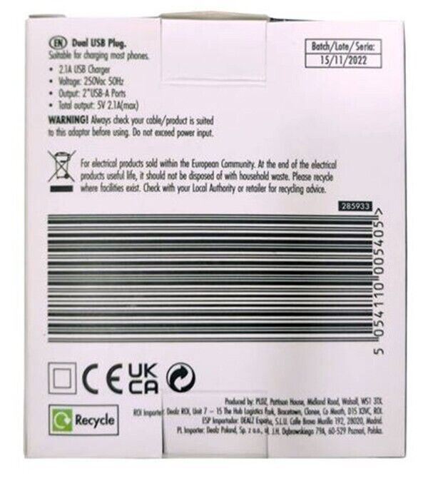 VIDO 2.1 AMP Fast Dual Twin 2 Port USB Charger for UK Mains Wall Plug #05405 UK