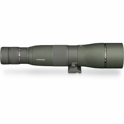 Vortex Razor HD 22-48 x 65mm Straight Spotting Scope + Case HD Glass Key Features The Vortex Optics Straight-viewing Razor HD 22-48x65 Spotting Scope is engineered with superior glass and specialized optical coatings to provide clear and bright images at all magnifications. The triplet apochromatic lens configuration is made of high-density (HD) extra-low dispersion (ED) glass to increase light transmission, minimise distortion, and virtually eliminate chromatic aberration. All air-to-glass surfaces have Vortex's XRPlus anti-reflective coatings to minimise light loss and maximise image brightness, while the Porro prisms have highly reflective dielectric coatings that improve brightness, clarity, and colour accuracy. This combination of coatings and optics creates a spotting scope that produces bright, clear, high-contrast images with accurate colour rendition. The lightweight and armoured magnesium-alloy chassis is O-ring sealed and argon filled to be water and fog-proof. A helical focus system, with a wide adjustment collar, allows for fast, yet fine focusing even when wearing gloves. The scope has a 1/4"-20 tripod mounting shoe and a tripod collar that rotates to permit the eyepiece to be positioned in the best viewing position. A retractable lens shade helps to reduce glare while keeping snow or rain off the objective lens. Performance Use and Handling Construction Details What’s Included? Specification Viewing Angle Straight Magnification 22 to 48x Objective Lens Diameter 65 mm Field of View 22x: 138.0' @ 1000 yd / 46.0 m @ 1000 m Minimum Focus Distance 26.2' / 8.0 m Exit Pupil Diameter 22x: 3 mm Eye Relief 17.0 to 16.7 mm Fog-proof Yes, Argon Filled Water Resistance Waterproof Tripod Mounting Thread 1/4"-20 Dimensions L: 15.6" / L: 39.6 cm Weight 3.6 lb / 1.6 kg Package Weight 5.715 lb Box Dimensions (LxWxH) 15.95 x 7.75 x 6.6"