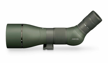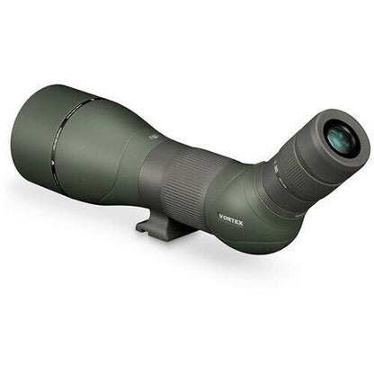 Vortex Razor HD 27-60 x 85mm Angled Spotting Scope + Case HD Glass Key Features The Vortex Optics 45° angled-viewing Razor HD 27-60x85 Spotting Scope is engineered with an oversized objective, superior glass, and specialized optical coatings to provide clear and bright images at all magnifications and lighting conditions. The triplet apochromatic lens is made of high-density (HD) extra-low dispersion (ED) glass to increase light transmission, minimize distortion, and virtually eliminate chromatic aberration. All air-to-glass surfaces have Vortex's XRPlus anti-reflective coatings to minimise light loss and maximize image brightness, while the Porro prisms have highly reflective dielectric coatings that improve brightness, clarity, and colour accuracy. This combination of coatings and optics creates a spotting scope that produces bright, clear, high-contrast images with accurate colour rendition. The lightweight and armoured magnesium chassis is O-ring sealed and argon filled to be water and fog-proof. A helical focus system, with a wide adjustment collar, allows for fast, yet fine focusing even when wearing gloves. The scope has a 1/4"-20 tripod mounting shoe and a tripod collar that rotates to permit the eyepiece to be positioned in the best viewing position. A retractable lens shade helps to reduce glare while keeping snow or rain off the objective lens. Performance Use and Handling Construction Details What’s Included? Specification Viewing Angle Angled Magnification 27 to 60x Objective Lens Diameter 85 mm Field of View 27x: 117.0' @ 1000 yd / 39.0 m @ 1000 m Minimum Focus Distance 16.4' / 5.0 m Exit Pupil Diameter 27x: 3.1 mm Eye Relief 17.0 to 16.7 mm Fog-proof Yes, Argon Filled Water Resistance Waterproof Tripod Mounting Thread 1/4"-20 Female Dimensions L: 15.5" / L: 39.4 cm Weight 4.1 lb / 1.9 kg Package Weight 6.6 lb Box Dimensions (LxWxH) 15.8 x 7.6 x 6.8"
