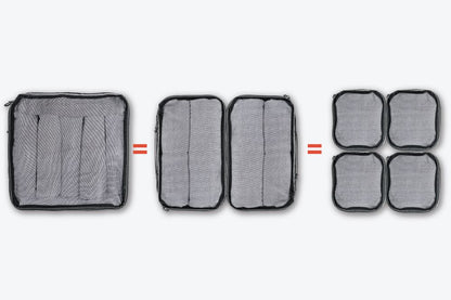 Three sizes of Packing Cubes create an easy-to-understand organization system. The small cube is half of the Medium, the Medium is half of the Large. Mix and match to create the perfect packing organization system for your needs.