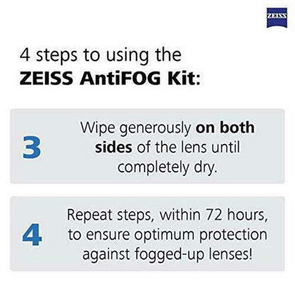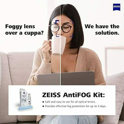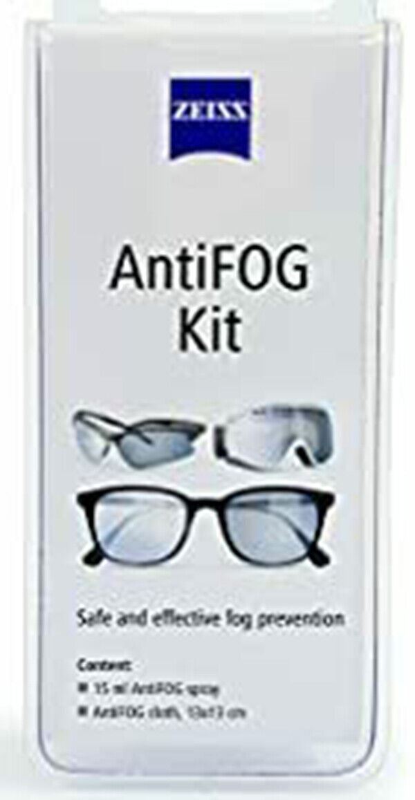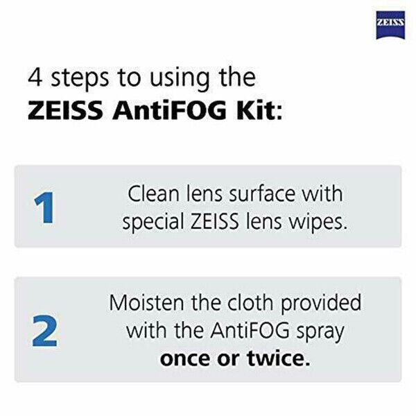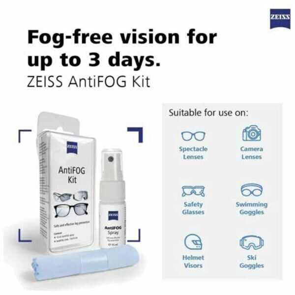 Provides effective fog-free vision for up-to 3 days. Creates a thin film, comparable to an additional coating, to protect lenses from fogging. Quick, gentle and easy to use. Convenient and portable for use at home or on-the-go. Safe and easy to use for all optical lensesZeiss Anti-Fog Kit with 15ml Spray and Treated Cloth
