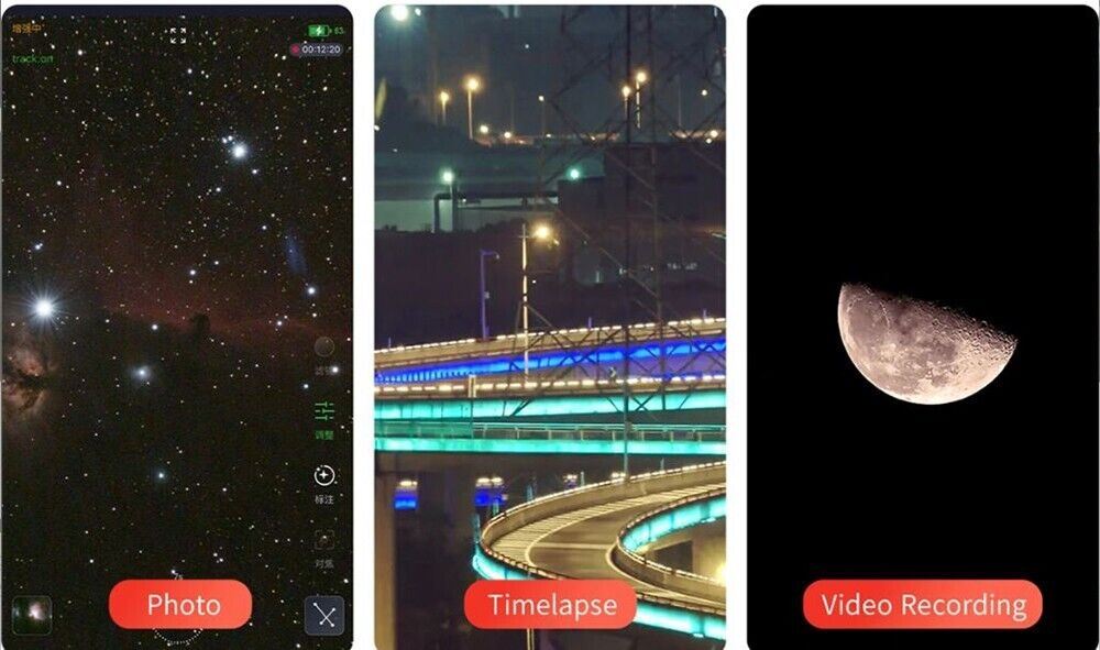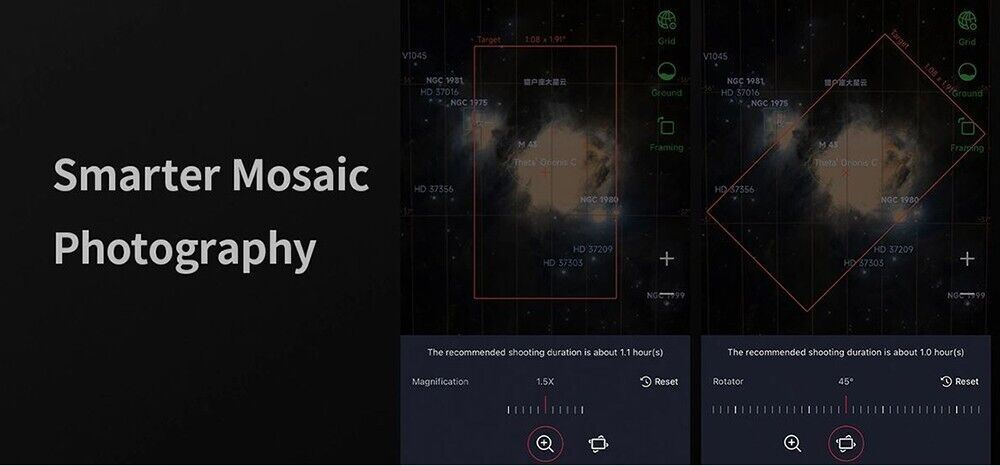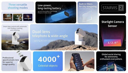 Smarter mosaic photography and three versatile shooting modes (Solar system objects, Deep sky objects and Scenic view) offer effortless and rewarding viewing of the night sky.